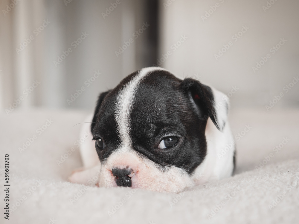 Lovable, pretty puppy lying on the windowsill. Clear, sunny day. Close-up, indoors. Studio photo. Day light. Concept of care, education, obedience training and raising pet
