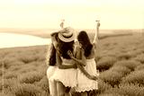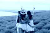 Positive girlfriends standing in lavender field and raised the glasses of white wine at sunset. Women on the picnic. Happy women life style.