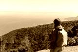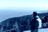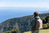 Woman with a backpack taking in the majestic view of a coastal landscape