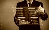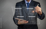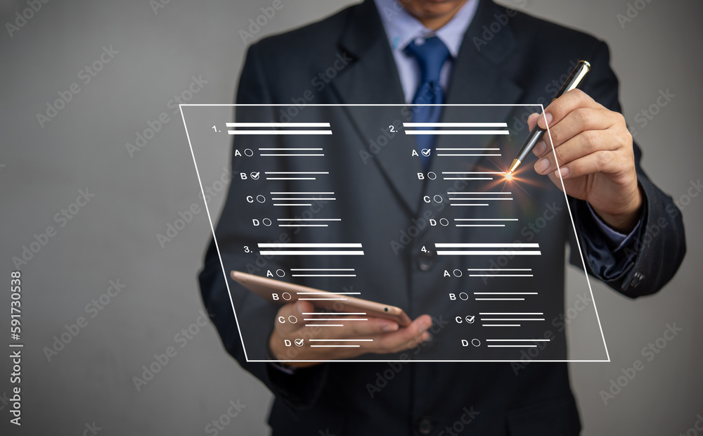 man chooses questionnaire with checkbox, survey form online, answer questions in the exam of test business checklist and filling survey form online using technology for education, learning.