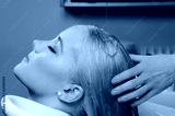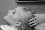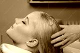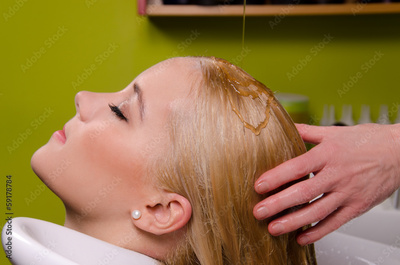 Hairdresser washing blond haired woman in the barber shop.
