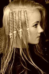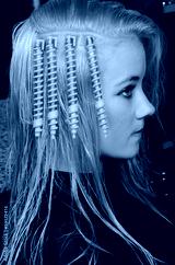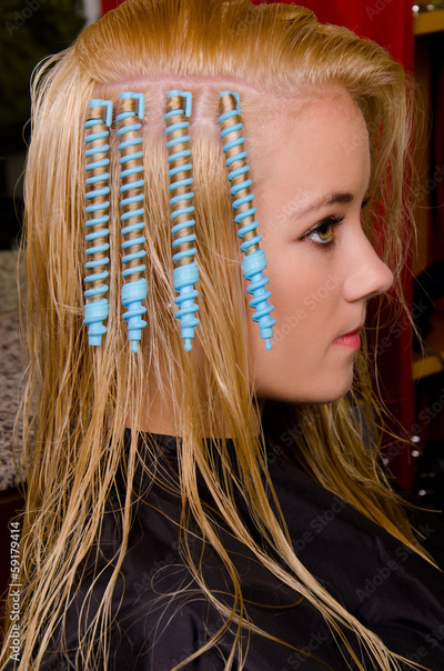 Blue curlers on the head in the hairdresser saloon.