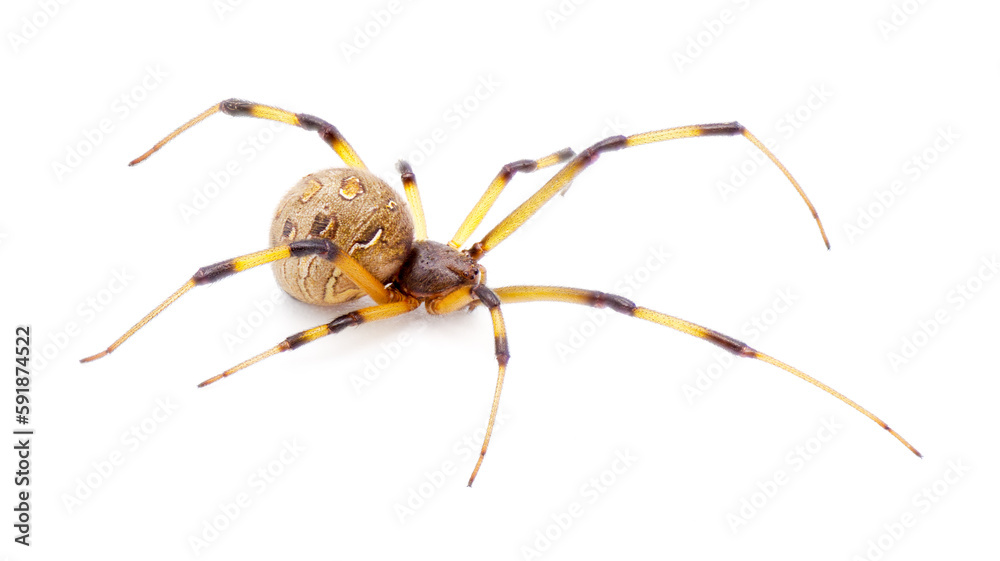 Latrodectus geometricus, commonly known as the brown widow, brown button spider, grey widow, brown black widow, house button spider or geometric button spider Side view isolated on white background