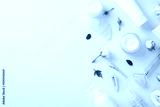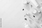 Elevate your branding game with this gorgeous skin care top view flat lay, complete with cream bottles, rose petals, and an empty heart on a calming pastel beige backdrop