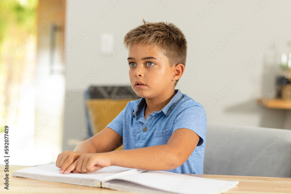 Caucasian cute blind boy reading braille book on table while sitting at home, copy space