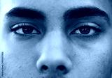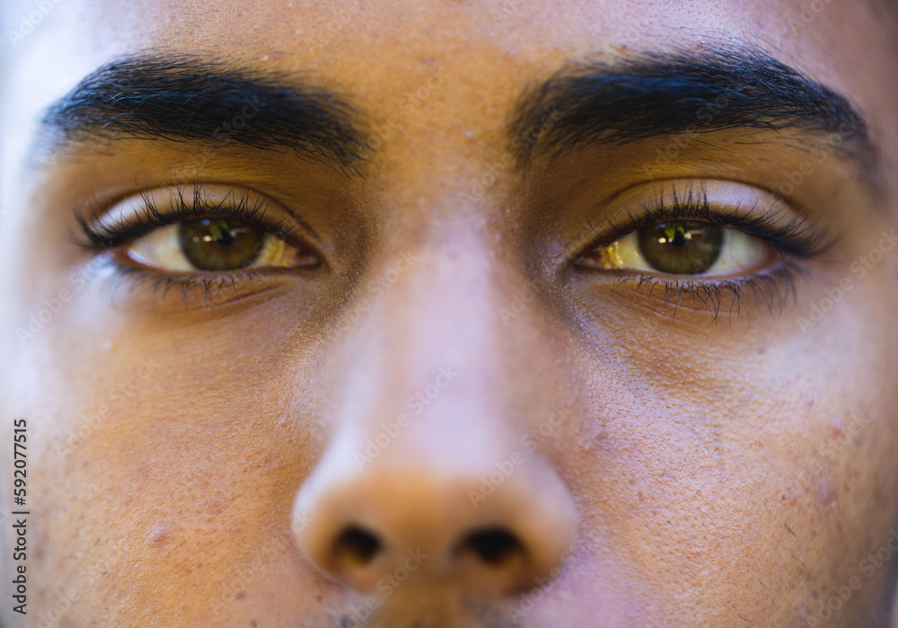 Close up of brown eyes of biracial man looking at camera
