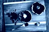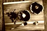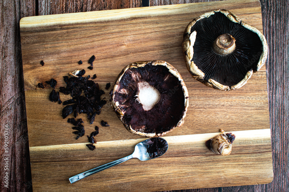 Cleaning and Stemming a Pair of Portobello Mushroom Caps: Scraping the gills out of raw mushroom caps on a wooden cutting board