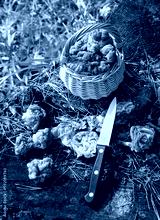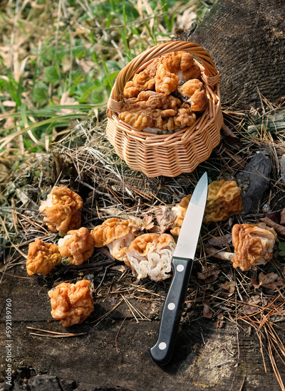 Gyromitra gigas mushrooms in wicker basket and knife, natural abstract background. early spring season, fresh mushrooms picking in forest. useful edible spring mushrooms