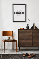 Stylish living room interior composition with mock up poster frame, brown wooden commode, armchair and small home decorations. White wall. Copy space. Template. .