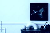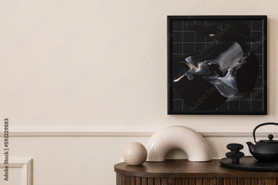 Minimalist composition of living room interior with mock up poster frame, copy space, wooden sideboard, stylish sculpture, black pitcher, trace and personal accessories. Home decor. Template.