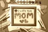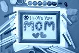 Congratulations from a child on Mother's Day. Bright hand drawn childish card with crafted plasticine colorful mom lettering, butterfly. Flat lay children's creative handmade modeling Clay