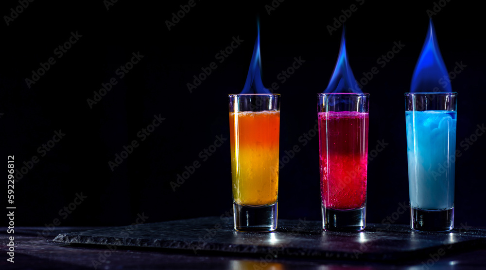 Cocktails Party Shots and Shooters on bar counter in a restaurant, pub. Miniature mixed drinks. Alcoholic cooler beverage at nightclub on dark background