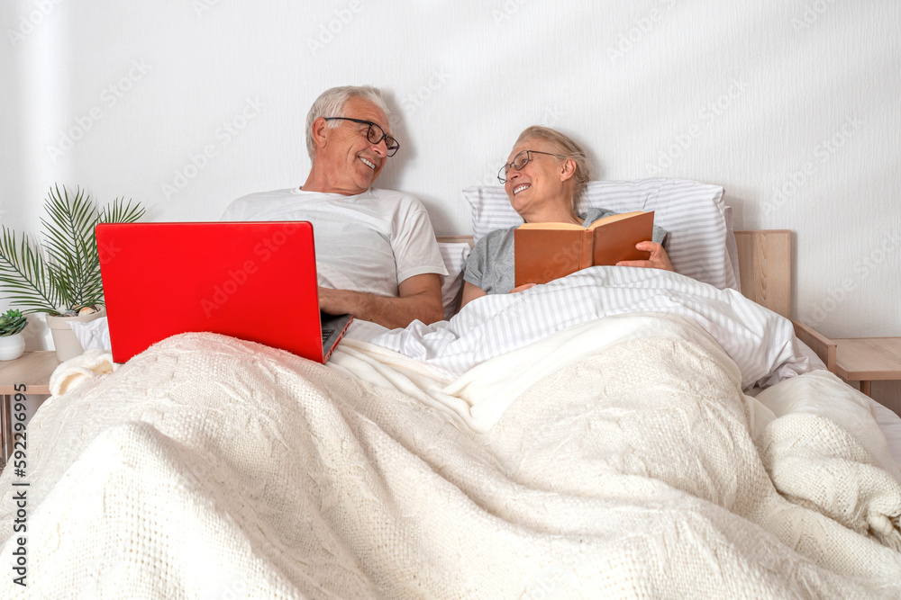 Senior couple spending leisure time in bed. A woman reads a book, a man works with a laptop while lying in the bedroom