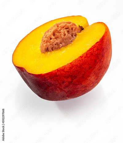 Peaches on a white isolated background. Ripe fresh tropical nectarine fruit piece with pit.