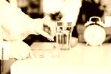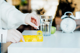 Woman's hands sorting pills into pills organizer. Close up medical pill box with daily doses of medicines. Time for Antioxidant diet vitamin supplements for health and beauty care, biohacking concept.