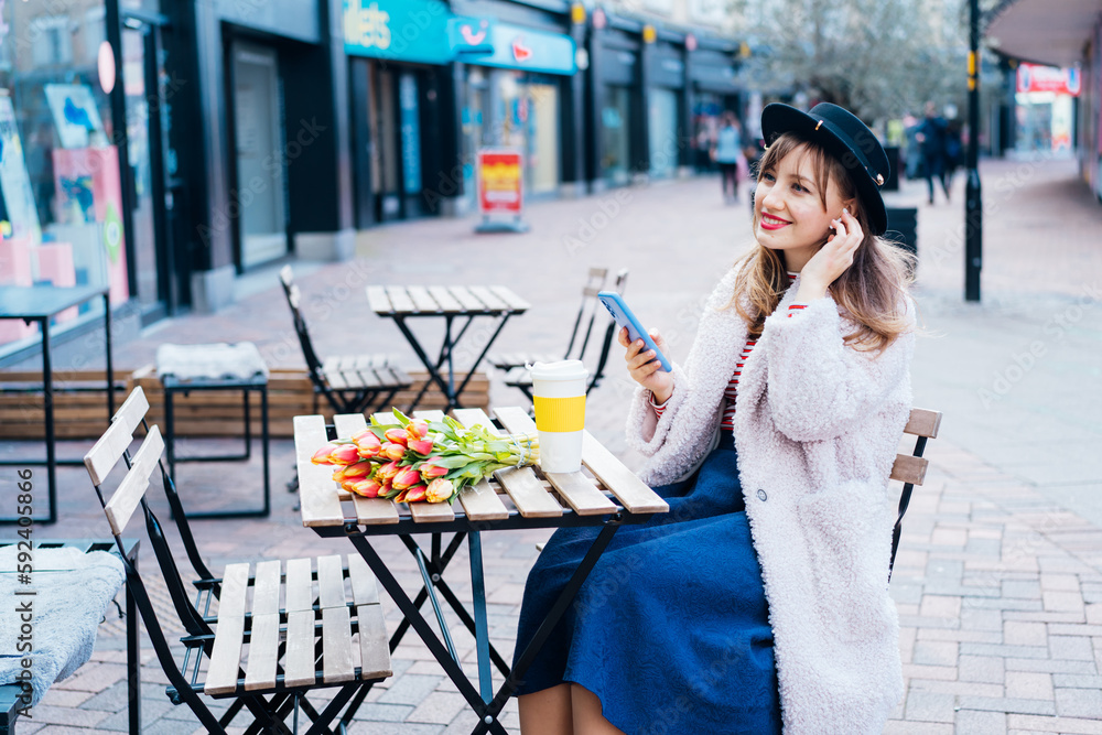 Stylish young smiling woman enjoying coffee from a reusable cup, listening to music, podcast using wireless earbuds and phone in street cafe. Fresh tulips bouquet on table. Springtime street fashion