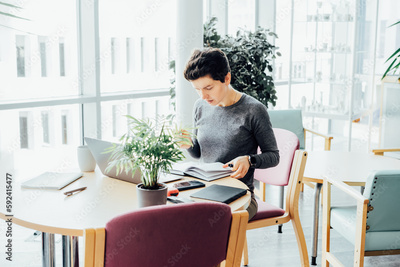 Pensive middle aged neutral gender business woman interviewing person online, using laptop, making notes in her paper notebook, looking concentrated. Online video call, IT HR specialist, recruiting.