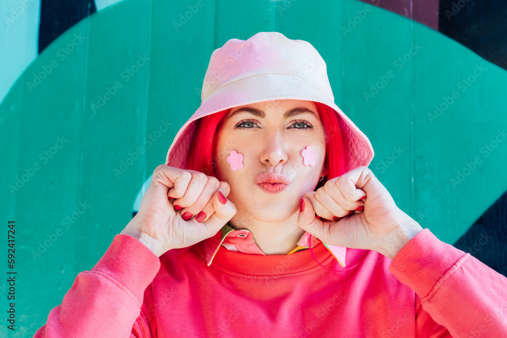 Young woman with pink hair in bright magenta sweatshirt, bucket hat and flower stickers on her cheeks. Anime style. Summer spring urban street fashion. Vanilla Girl. Kawaii vibes. Candy colors design