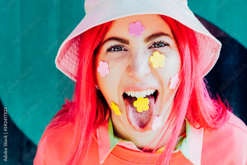 Close up young woman with pink hair in magenta sweatshirt, bucket hat and flower stickers on face and tongue. Anime style. Vanilla Girl. Kawaii vibes. Candy colors design. Summer spring urban fashion.