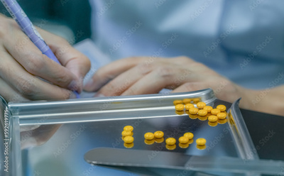 Yellow sugar coated tablet pill on stainless steel drug tray. Pharmacist hand holding pen and writing drug instructions on plastic pill pack. Prescription drug. World pharmacist day. Pharmacy concept.