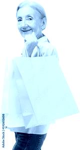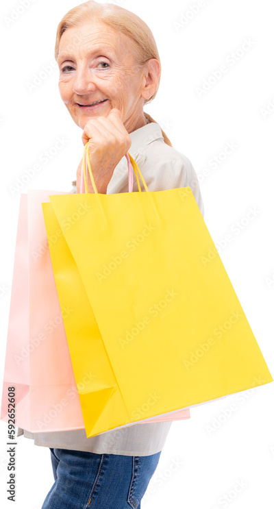 Happy senior woman enjoying shopping Old lady hold shopping bag Tourism abroad elderly female look at camera Sales low prices isolated on gray background copy space Grandmother has good health Strong