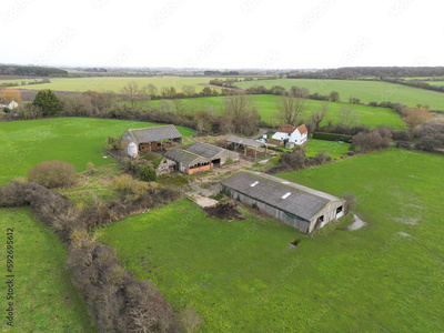 Drone view of a derelict dairy farm showing the cow sheds and grain hopper. The white farm building is still in use.