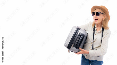 Happy elderly woman hold baggage Old lady going to travel on holiday Retired woman look at blank space Tourist travel abroad in free time rest getaway Air flight trip journey weekend holiday concept
