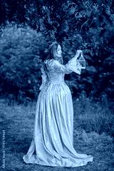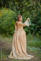 A beautiful young woman in a historical golden dress with a crown on her head holds a white cage in her hands. Princess in a medieval dress in the forest.