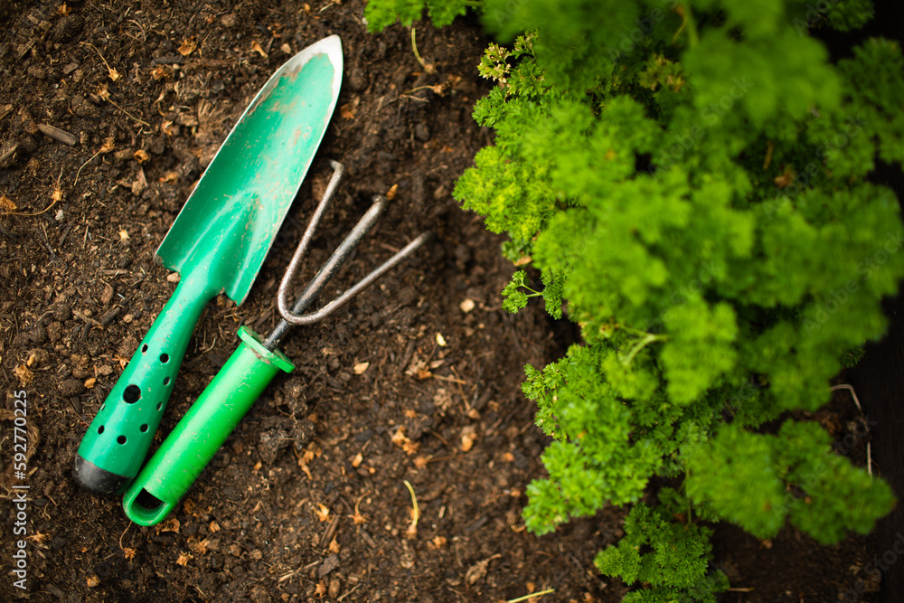 Gardening tools on fertile soil texture background seen from above, top view. Gardening or planting concept. Working in the spring garden.