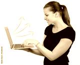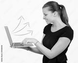 Smiley woman with laptop and arrow