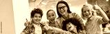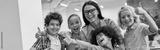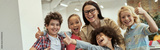 We are the best. Happy school team of four cute little pupils and their friendly female teacher posing together, standing in the classroom