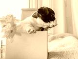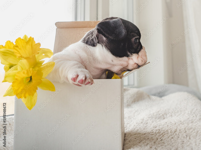 Cute puppy, bright flowers and a paper box by the window. Clear, sunny day. Closeup, indoors. Studio photo. Day light. Concept of care, education, obedience training and raising pets