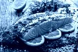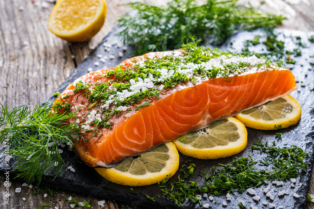 Gravlax - fresh marinated salmon steak in salt and dill on black plate on wooden table