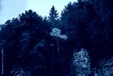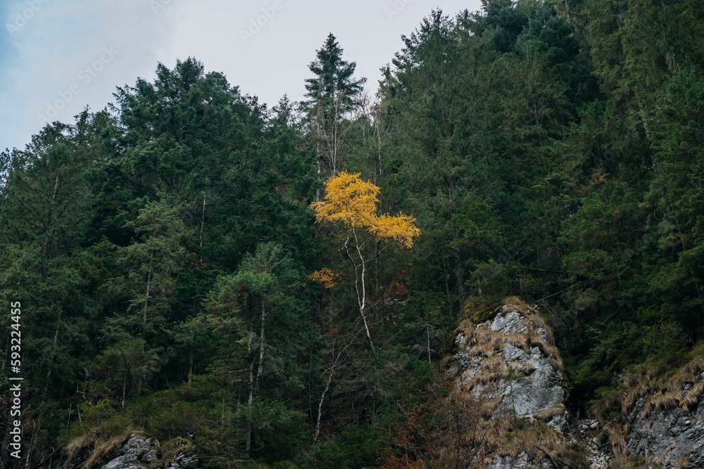 Closeup shot of an isolated yellow tree on a hill surrounded by green trees