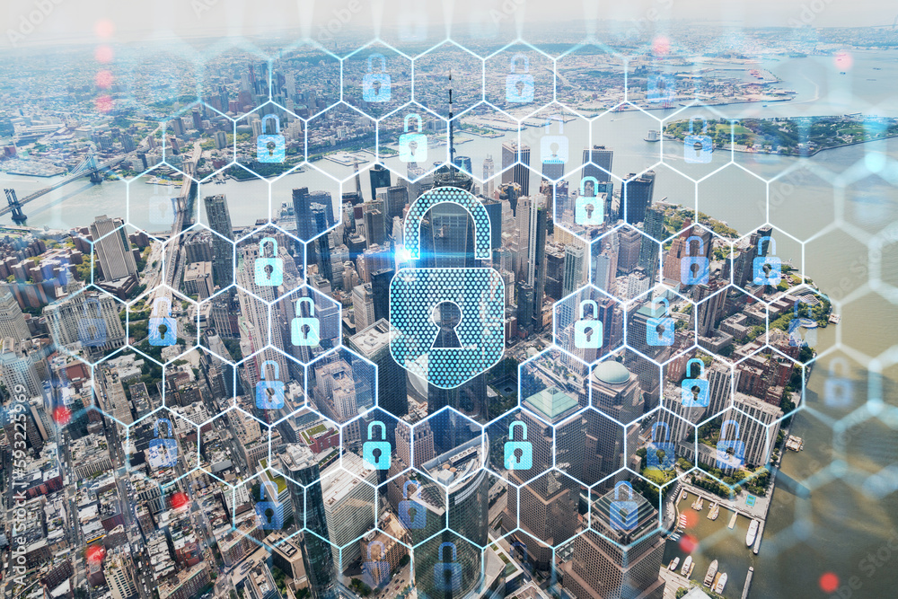 Aerial panoramic helicopter city view, Lower Manhattan, Downtown, New York, USA. World Trade Center, bridges. The concept of cyber security to protect confidential information, padlock hologram