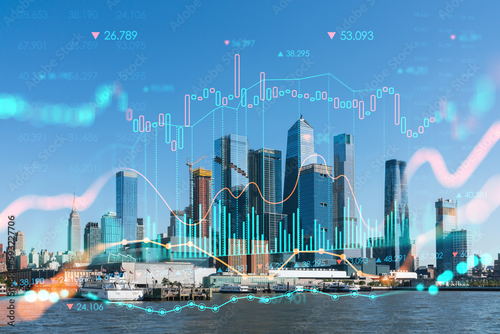 New York City skyline from New Jersey over Hudson River towards the Hudson Yards at day. Manhattan, Midtown. Forex graph hologram. The concept of internet trading, brokerage and fundamental analysis