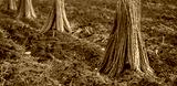 Cassava farm. Manioc or tapioca plant field. Bundle of cassava trees in cassava farm. The plowed field for planting crops. Sustainable farming. Agriculture in developing countries. Staple food crop.