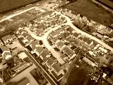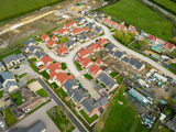 Aerial view of new bungalow hosing development seen in rural Cambridgeshire. The distance shows further land being excavated for new homes.