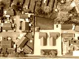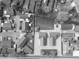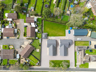 Aerial top down view of a pair of new detached bungalows seen adjacent to established housing and gardens.