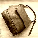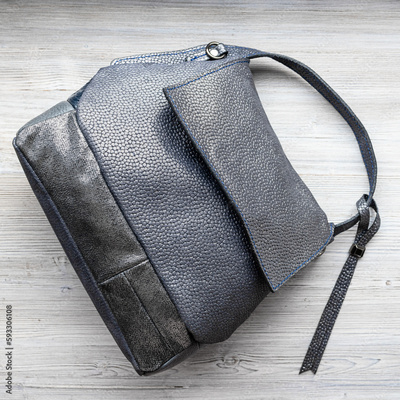 soft handcrafted grey leather handbag on gray wooden board