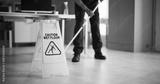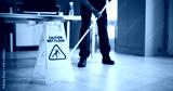 Male Janitor Cleaning Floor With Caution Wet Floor Sign