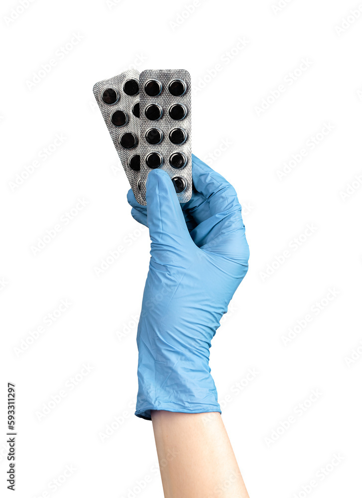 Activated charcoal, black pills of medical coal in blister in hand in glove isolated on white