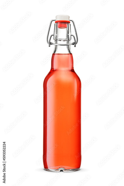 Glass transparent swing bottle with red low alcohol or soft drink without label isolated on a white.