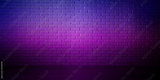 Room with brick wall and wooden floor in neon lights, banner design
