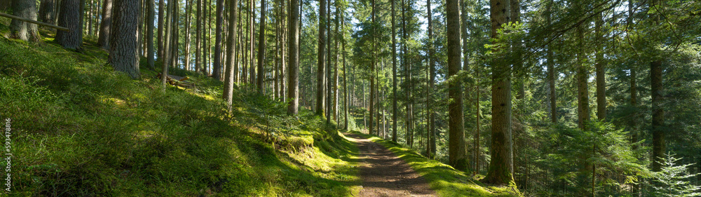 Panoramic wallpaper background of forest woods (Black Forest) landscape panorama - Mixed forest fir and spruce trees, lush green moss, blueberries and path with sunshine sunbeams