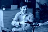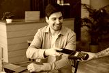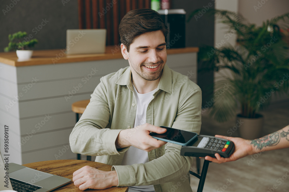 Young fun man wear casual clothes sit alone at table in coffee shop cafe restaurant indoors work on laptop pc computer hold bank terminal process acquire mobile cell phone payment. Freelance concept.
