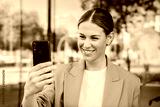 Young successful business woman with suit watching on the cellphone her shares of stock and investments. Happy corporate executive female browsing on internet using a smart phone device on a workspace