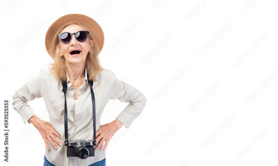 Happy elderly woman laughing Old lady going to travel on holiday wear hat sunglasses camera Tourist travel abroad in free time rest getaway Air flight trip journey long weekend holiday concept