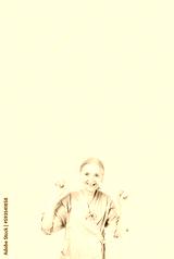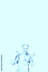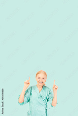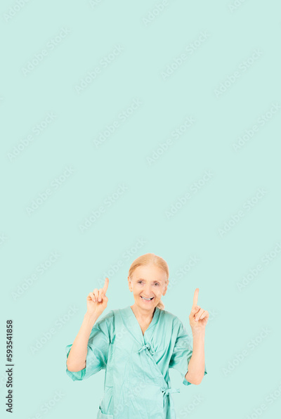 Smiling Elderly patient woman wearing patient uniform looking to camera Old lady point finger up to above Health care Hospital and Insurance concept isolated over green background copy space