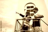 Two windmill engineer pointing to the turbine they have to do maintenance on. Renewable energy technicians expert taling, working together and doing an inspection of the generator checking the power